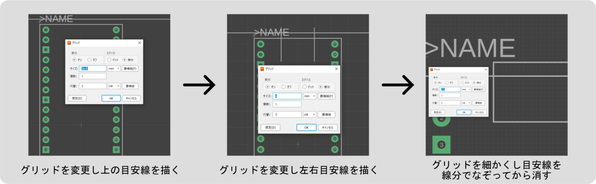 新しいフットプリントファイルを作成したら、作業エリアのグリッド単位をmilからmmに変更しておきます。もちろんmilのままでも構いませんが、ドリルの穴計やデータシートの寸法単位がmmなので、それに合わせた方が楽です。