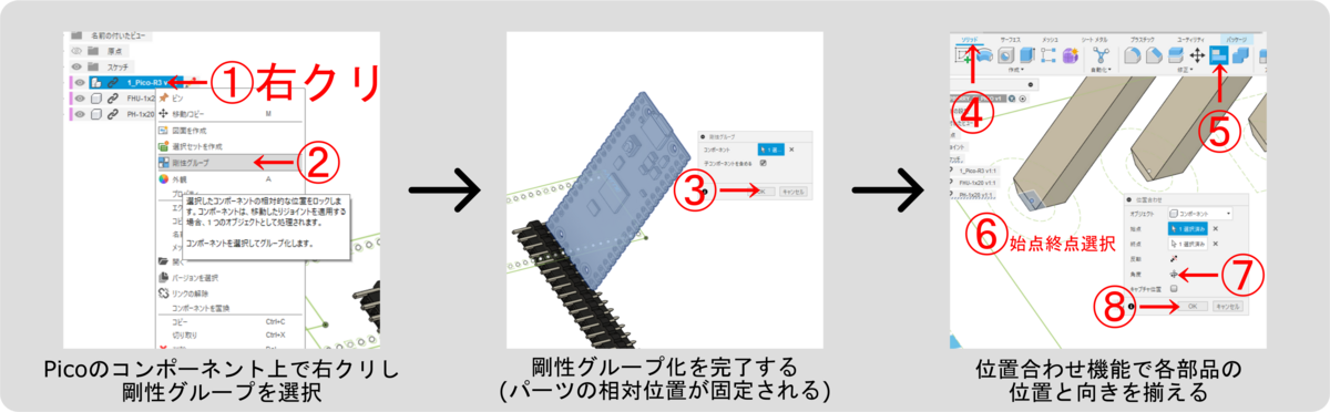 Picoの3Dモデルは初期状態だと相対位置が固定されていいないため、剛性グループ化で相対位置を固定しておきます。