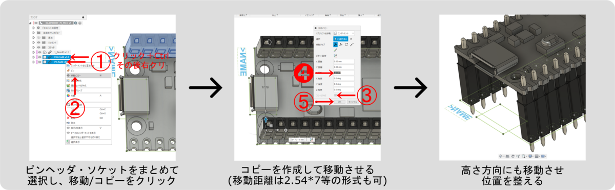 ピンの位置を合わせたら、ピンヘッダとソケットを選択して「コピーを作成」にチェックをつけてもう片側に移動(複製)します。
